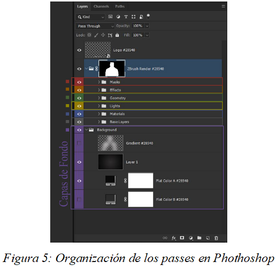 Estos passes han sido distribuidos de una manera automática: Mask: Contiene los passes de Mask de cada Subtool que componen el modelo 3D, el uso de esta carpeta es la de seleccionar áreas específicas de la imagen mediante las máscaras. Effects: Como su nombre lo dice contiene passes que generan efectos específicos en la imagen, esta carpeta contiene los passes de Wireframe, Specular, Ambient Oclussion, SSS y Shadows. Geometry: En esta carpeta se encuentran passes relacionados directamente que con la estructura del modelo 3D tales como SubtoolID, PolygroupID, Depth, Color Bump, Ts Normal, OS Normal y Structure, la mayoría de estos passes pueden ser usados como mascaras. Lights: Contiene los passes de las distintas luces, Back Right Light, Back Left Light, Back Top Light, Right Light, Left Light y Front Light, regularmente luces principales y de relleno. Materials: Esta carpeta contiene passes de materiales si es que decide agregar materiales extras a la composición 3D. Baselayers: Contiene los passes generados desde un solo pase BPR en ZBrush, como Preview, Albedo, Best y BPR.