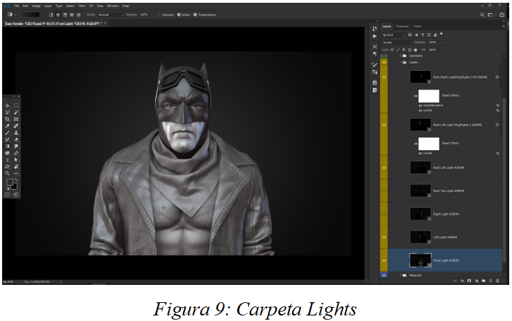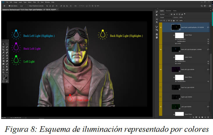 El proceso desarrollado comienza con los passes de luces básicos que exporta ZBrush por default. Es un esquema de 5 luces, 3 principales y 2 de relleno para crear los Highligts y no crear sombras sobresaturadas o luces demasiado brillantes, las luces que se utilizaron en esta composición son Back Right Light (HighLights), Back Left Light (HighLights), Left Ligh, Back Left Light y Front Light [fig. 8]. Es importante agregar las luces necesarias debido a que la iluminación afectara drásticamente las texturas y la saturación general del personaje generando la atmosfera deseada.