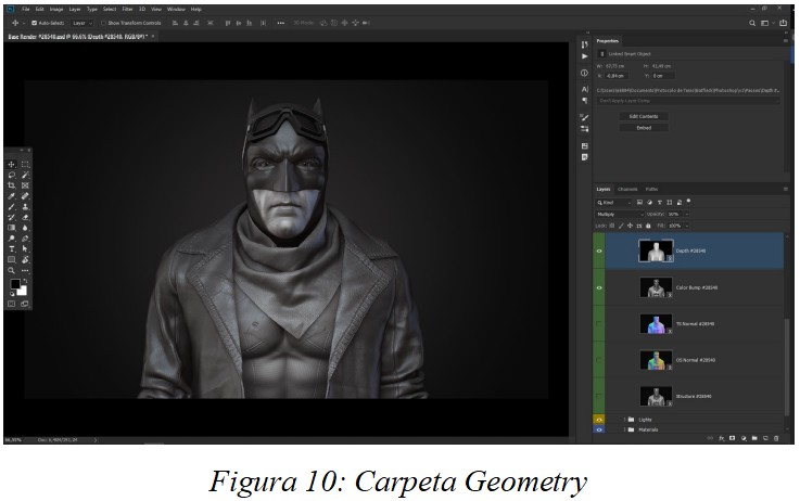 La carpeta Geometry contiene los passes relacionados con la estructura e identificación de la escultura digital mayoritariamente estos son SubtoolID, PolygroupID, Depth, Color Bump, Ts Normal, OS Normal y Structure, para efectos dentro de mi Workflow los passes que considero indispensables emplear son Depth y Color Bump aunque los otros mapas también pueden generar efectos interesantes, Depth lo puede usar de dos maneras, considerando que es un pase que se basa en información en base a profundidad en el eje Z lo puede implementar como una máscara para poder generar profundidad de campo lo que agrega realismo a la escena, la otra manera de emplearlo es como una fuente de luz con un degradado mucho más suave, aunque como se mencionó antes en este caso particular se requeria recuperar más sombras que aportaban a la narración visual así que el modo de fusión Multiply le ayudara a generar este efecto, por otro lado Color Bump podría describirse como una especie de displayment map muy básico el cual nos ayuda a resaltar un poco el micro-detalle que pueda perder mediante la iluminación o el SSS y también generar un poco de contraste lo que también le ayuda a eliminar los reflejos especulares dentro de los poros o cavidades muy pequeñas de manera no destructiva, lo que funciona con superficies con detalles muy pequeñas como la piel, es importante que ponga atención en esos detalles nada es perfecto en la vida real agregar imperfecciones con estos passes ayuda a vender la credibilidad del personaje, el mejor modo de fusión para lograr esto es Multiply, aunque tendríamos que regular la opacidad para no obscurecer demasiado la imagen.