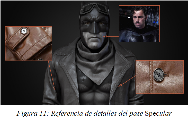 Con la iluminación y detalles creados y ajustados, es hora de que agregue más luz para generar y refinar los detalles finales. Estos passes los colocara sobre las capas anteriores. Para la capa de Specular la cual podría describirse como la reflexión de los objetos, en general para la mayoría de las capas en esta carpeta puede usar un modo de fusión ligera como Multiply y dependiendo del material puede ir ajustando la opacidad de cada una para controlar su intensidad es recomendable duplicar (Ctrl + J) la capa por cada objeto que requieran estos passes, los ajustes se basan en la mera observación del objeto en la realidad para poder simular un aspecto lo más real posible, esta es la parte del proyecto donde necesitara un poco más de paciencia y observación. Después de algunos comentarios, se puede observar una cierta necesidad de acercarse a la referencia del personaje original sin perder las características del concepto. Entonces, nuevamente, puede reunir más referencias de los diferentes materiales que componen la imagen para comparar algunas de las características y obtener el siguiente resultado [fig. 11], el pase de Ambient Oclussion se define como la luz ambiente, esta luz es la que le permitirá unificar la iluminación que anteriormente había creado y luzca de una manera más natural, la intensidad de este pase juega un papel importante en la suavidad de las sombras y la intensidad de las reflexiones especulares. Tener una intensidad de iluminación más pequeña creará sombras más duras y hará que el reflejo Specular sea más estrecho al aumentar la intensidad de la iluminación se crean sombras más suaves y los reflejos especulares se hacen más amplios, cambiando la forma en que se percibe la forma, por último, Shadows le permite generar sombras más difusas y por ende de un aspecto más natural y orgánico.