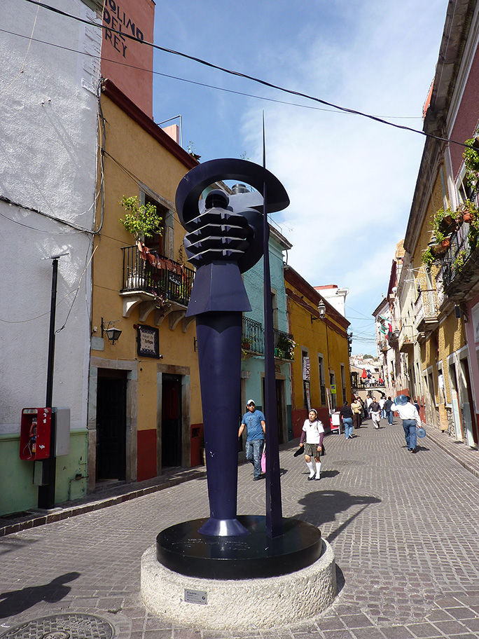 Analicemos otro ejemplo: la calle del Campanero, importante no solo por su belleza y composición, ha marcado la entrada a la ciudad de Guanajuato por el ejército insurgente, esta vialidad peatonal  despejada por siempre, ahora es bloqueada por una gran escultura del Quijote del artista Sebastián. Y qué decir del mal tino de colocar otra escultura del artista abstracto Leonardo Nierman, justo en el arroyo de la calle, junto  a una muy pequeña plazoleta triangular, entre la plaza del Ropero y el inicio del andador del Campanero, donde lógicamente  ha sido golpeada  varias veces por camiones de transporte y de carga y recientemente reparada. Por lo que habría de preguntarse, si efectivamente se pensó en la ubicación ideal de estas esculturas.