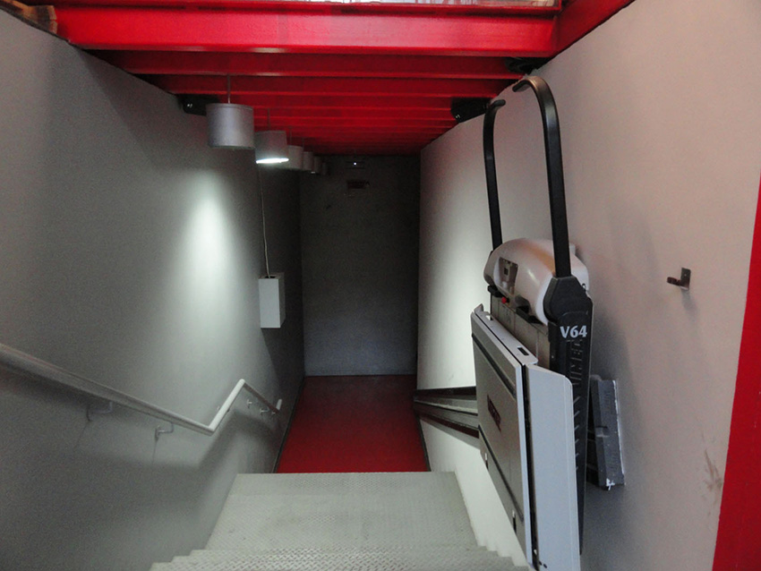 escalera que cuenta con un artefacto que facilkita el acceso a para personas de movilidad reducida, factor que indica que atienden los lineamientos establecidos en el Libro Blanco del Diseño donde se indica que el diseño debe ser contemplado para todos.