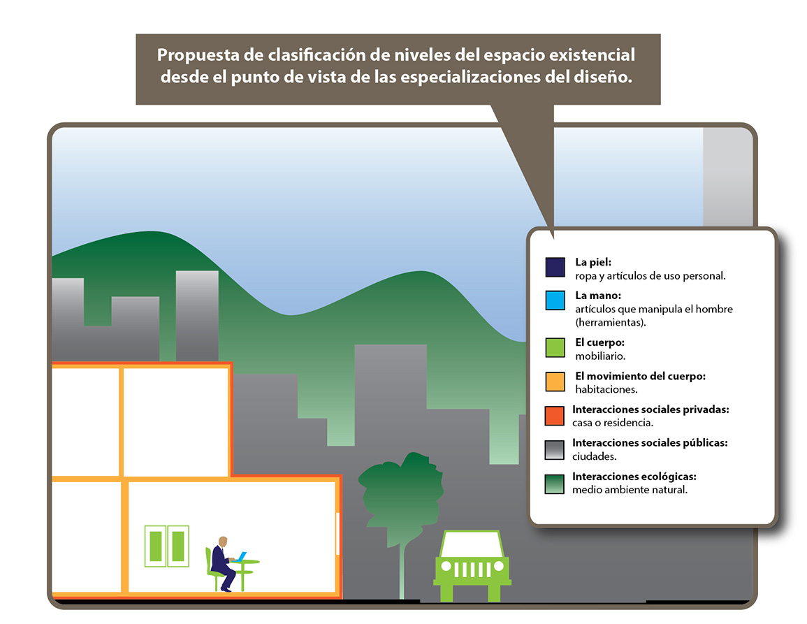 Por lo tato en base a la incidendia, especialización y evolución de la disciplina del diseño sobre la creación de los objetos que forman parte de los elementos del espacio existencial, y con los mismos criterios de proximidad y dimensión podemos clasificar los niveles de la siguiente forma