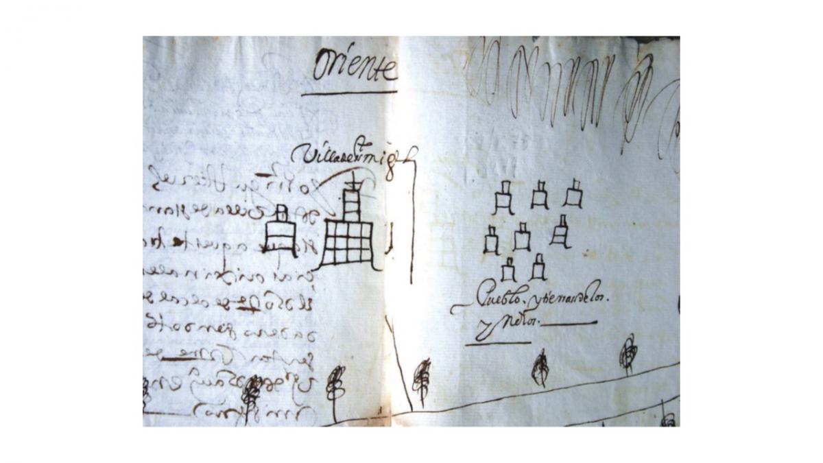 La imagen muestra el plano enviado por el Virrey de la Nueva España don Luis de Velasco, en él se muestran las tierras donadas para la fundación de la Villa de San Miguel el Grande.