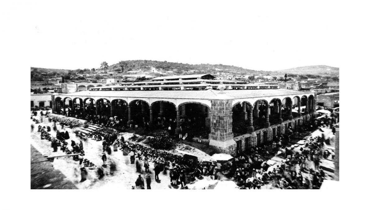 La imagen muestra el antiguo mercado Ignacio Ramírez edificado frente al Colegio de San Francisco de Sales en el año de 1891 y que fue demolido en el año de 1967, el diseño de este edificio es de Zeferino Gutiérrez quien también diseño la parroquia principal de la ciudad.