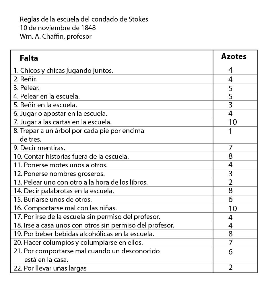 En este sentido, Tylor nos muestra a través de un documento escolar del siglo XIX, la cantidad de azotes normalizados que se aplicarían al niño que cometiera alguna falta a los reglamentos internos de una escuela ubicada en Carolina del Norte, Estados Unidos en el año de 1848.