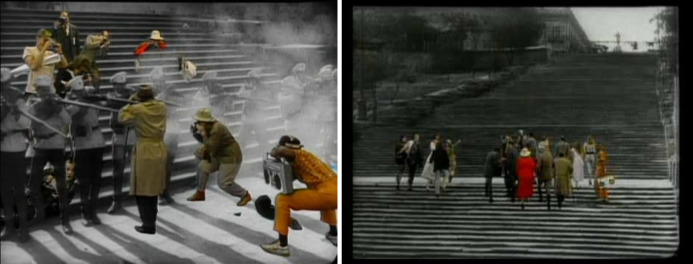 El fragmento de la masacre en las escalinatas de Odessa, es un asombroso acto de montaje inventado por el director Eisenstein y, que a saber, no tuvo paralelo en la historia dice Biosca. Existe una oposición rítmica y figurativa constante entre el grupo de cosacos y el grupo de la multitud, el director produce y se manifiesta de una manera muy viva expresada a través de los sentimientos de dolor, tristeza y de melancolía. En otro asombroso acto creativo, pero esta vez, de reinterpretación ya que el cineasta polaco Zbigniew Rybczyński filma en 1987 el corto Steps, donde en 25 minutos recrea la escena de las escaleras de Odessa en una nueva dimensión experimental incrustando electrónicamente a un grupo de coloridos turistas norteamericanos voyeuristas y convencionales sobre la imagen original en blanco y negro del film de Einsenstein: Rybczyński uses film and electronic media to create visual images which are not merely reflections of the superficial but rather penetrate the truths hidden deep inside. This is what the artist considers indispensable to achieve the aim of representing, and first and foremost, understanding the real world [32].