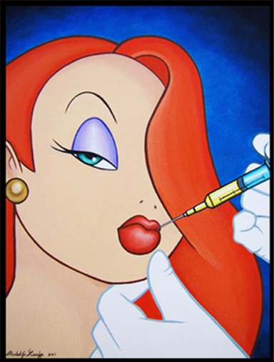 A continuación podremos observar 3 obras artísticas cuya temática se enfoca en Walt Disney con la intensión de develar el aura que rodea los mensajes de esta empresa. El primer ejemplo involucra la obra pictórica de José Rodolfo Loaiza Ontiveros [33] quien descontextualiza el universo creado por los dibujos animados, disocia los componentes y significados originales y los reconfigura en algo más cercano a lo ordinario desafiando una estética implantada durante décadas. Así que en su obra encontraremos a las princesas Cenicienta y Blancanieves, quienes muestran tener la misma orientación e identidad sexual a través de un beso en la boca o a Jessica Rabbit de la película Roger Rabbit inyectándose silicona en los labios, muestra del culto por la imagen que se vive en estos tiempos.