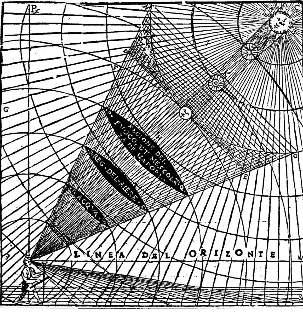 [Cuadro de texto: Imagen 1. Ilustración de Gianbattista Caporalis, 1536. Dando a entender el desarrollo de la perspectiva con el espacio] Es así que pintor italiano Gianbattista Caporalis, en su edición de los Diez Libros de Vitruvio (1536), incluye la ilustración de un hombre observando el universo (imagen1), percibiendo y organizando la perspectiva como la construcción del espacio. En la ilustración se sitúa a los ojos como el medio de la organización del espacio, colocando al hombre en la tierra y analizando el espacio. Esto de igual forma parte importante del desarrollo de la ciencia gracias a las teorías de Copérnico y Ptolomeo, que habían brindado durante el siglo XV.