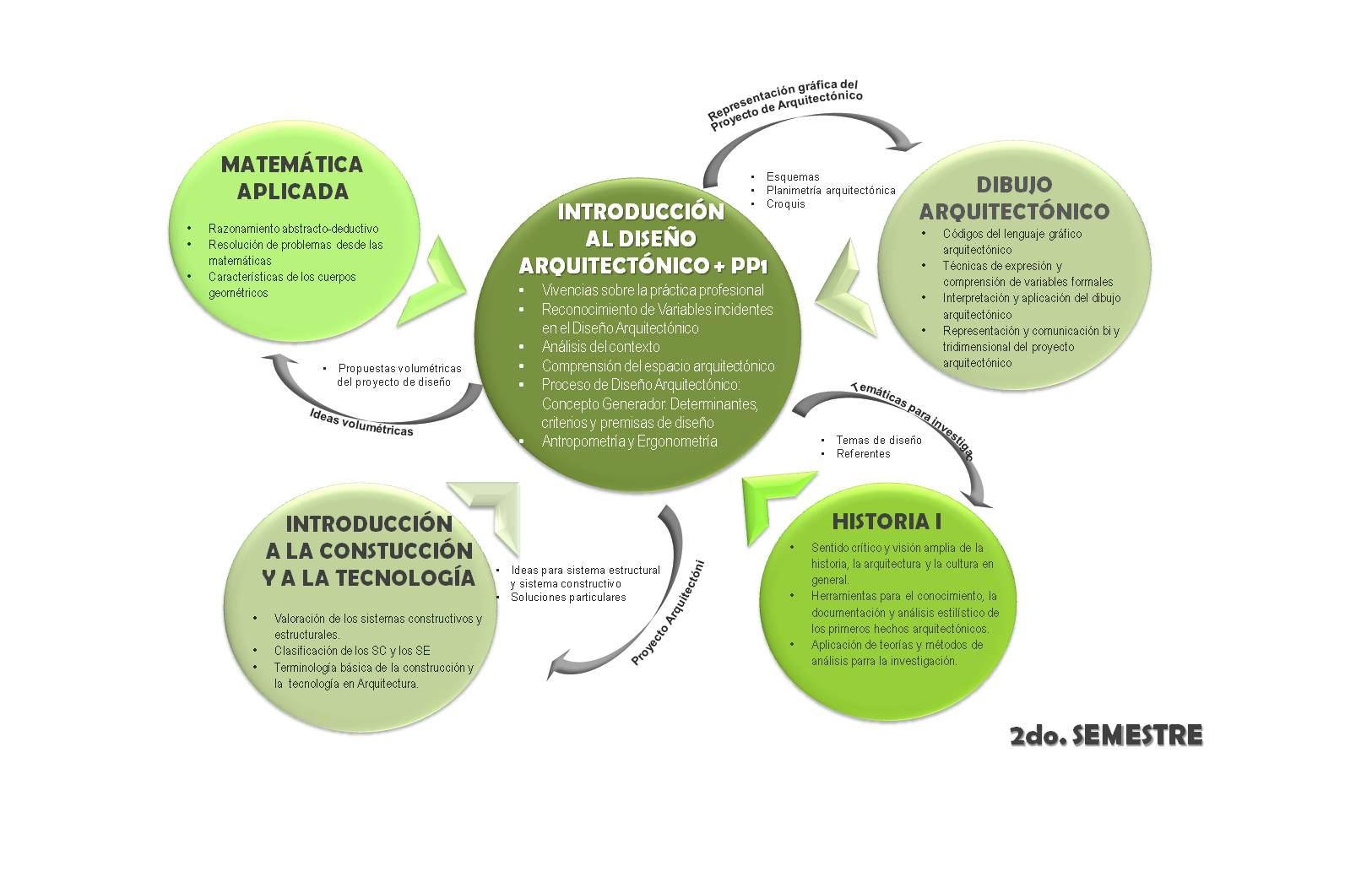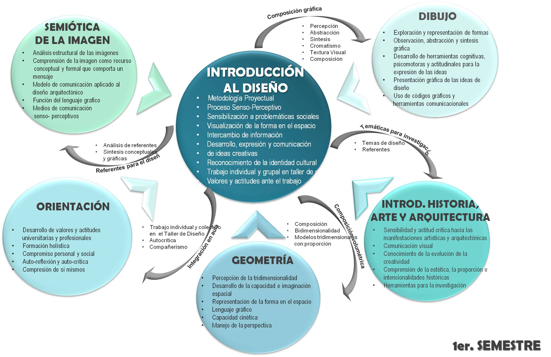 De igual modo, los autores antes mencionados proponen abordar los procesos formativos en Arquitectura de manera articulada, abierta y flexible para el desarrollo de competencias, «…cuya estructura hermenéutica se fundamenta en la subjetividad del ser humano…» posibilitando gradualmente la adaptación a los diferentes niveles de complejidad de actividades y procesos académicos, así como «…la articulación de diferentes materias del plan de estudios al taller de diseño…» (p.74).