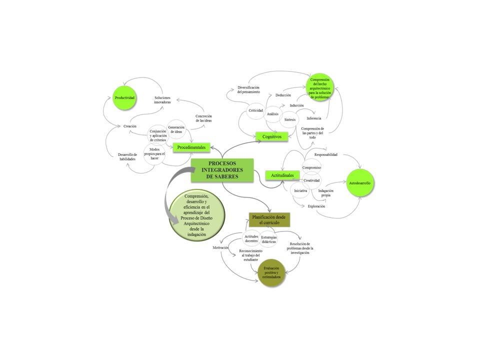 Paralelamente, de las interpretaciones a partir de lo expresado por los informantes surgió la categoría emergente Procesos Integradores de Saberes, en respuesta a la intencionalidad arriba expresada. Procesos estos, entendidos como aquellos procedimientos, acciones, maneras de conocer, hacer y ser, que ejecuta el estudiante de Arquitectura para vincular en el Taller, en términos de conocimientos, habilidades y destrezas los aprendizajes adquiridos en otras asignaturas, permitiéndole enfrentar, comprender, visualizar y desarrollar un proceso de diseño, para posteriormente presentar un producto que da cuenta de su aprendizaje del Diseño Arquitectónico.