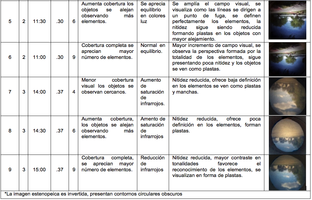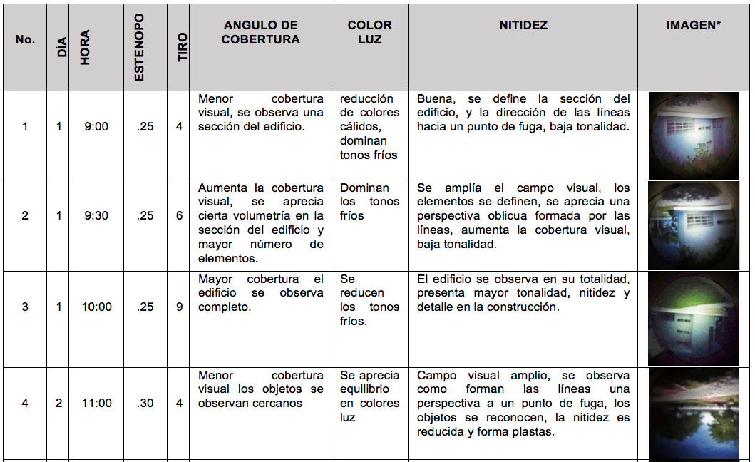 Las imágenes obtenidas fueron registradas con una cámara de celular, la tabla 1 relaciona las variables de estudio: estenopo, tiro o distancia focal, plano focal relacionado con tamaño de imagen generada, ángulo focal, color luz. Hora y día de registro fotográfico, diámetro de estenopo, ángulo de cobertura, en relación al cálculo matemático para la obtención de una imagen idónea.