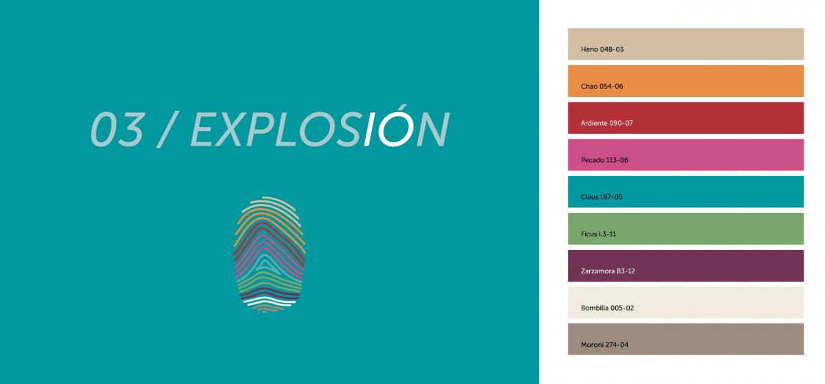 Una paleta llena de distintas tonalidades desde las más brillantes, hasta las más cálidas y neutras, pero que a su vez se complementan y nos recuerdan la riqueza de nuestras tradiciones y cultura, y no solo las nuestras, sino que nos da la oportunidad de admirar la riqueza cultural de otros lugares. Explosión evoca espacios vibrantes que se armonizan con la implementación de tonalidades neutras.