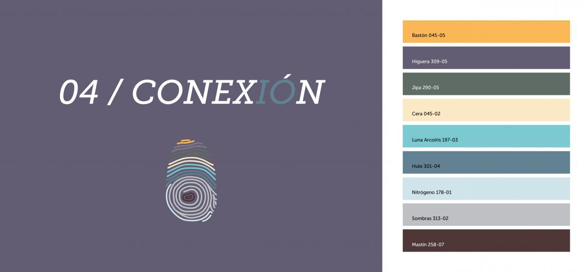 Inspirada en la naturaleza y sus bellas imperfecciones, conexión es una paleta de tonos armoniosos, fríos y en la que se complementan colores claros y oscuros para generar en las personas un estado de serenidad y paz interior en la que podemos reconectar con nosotros mismos y el espacio que nos rodea, hace una pausa en el ritmo de la vida y con la implementación de pocos, pero asertivos tonos cálidos y botánicos nos regala un poco de aquella magia que la naturaleza del sol y las plantas nos brindan en nuestro día a día.