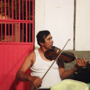 Ángel González, huapanguero arribeño y campesino, tocando el violín en su casa, Xichú, Guanajuato. Foto: archivo personal.
