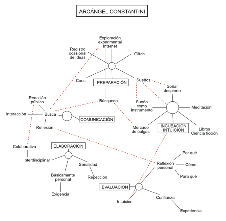 Recursos para la generación de ideas: El artista refiere trabajar con lucidez onírica, o lo que comúnmente se conoce como “soñar despierto”. La participación en talleres sobre percepción del entorno a través del sueño, la vinculación de espacios digitales de representaciones concretas de la realidad con el despertar del sueño: “el hacerte consciente que el espacio en el que estas experimentando es una construcción tuya y puede ser moldeable, modificado…” (Entrevista a A. Constantini), lo considera también una forma eficaz para generar ideas. La práctica de la meditación como recurso (algunas de sus obras están inspiradas en la meditación). El surgimiento de ideas a partir de un todo: del consumo, por ejemplo de libros de ciencia-ficción, por ejemplo de Philip k. Dick, Bradbury, Asimov, Stanislaw Lem, de la sociedad de consumo en general. Arcángel comenta que busca establecer un diálogo con el entorno: