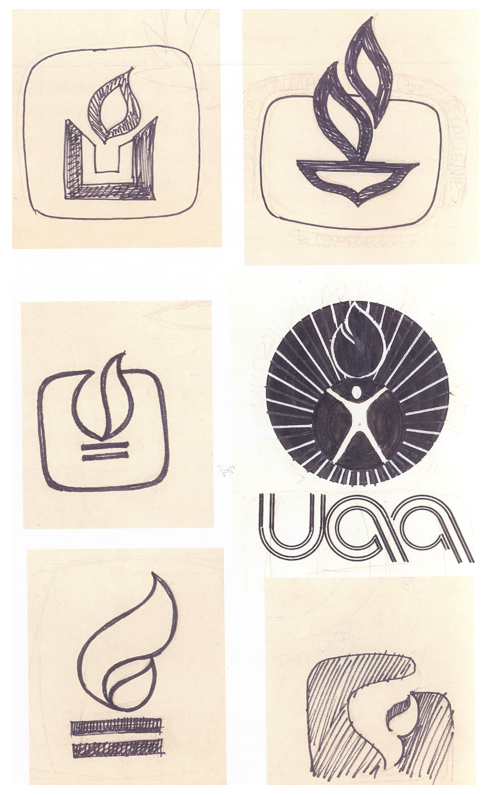 JLM: Originalmente cuando la UAA empieza, su logotipo tenía juntas la “U” y la “A” pero en la imprenta se empezó a deformar la imagen al grado que le decían “el elefantito de la universidad” (imagen 1), porque parecía una trompa y luego le pusieron ojos y orejas. Así decidieron cambiarlo porque le estaban dando un enfoque negativo y no tenía profundidad en su mensaje. Básicamente esa fue la inquietud que se le manifestó al rector en turno, así que llegamos a la conclusión de hacer un símbolo basado en la frase de la universidad - Se Lumen Proferre:  proyectar en luz.