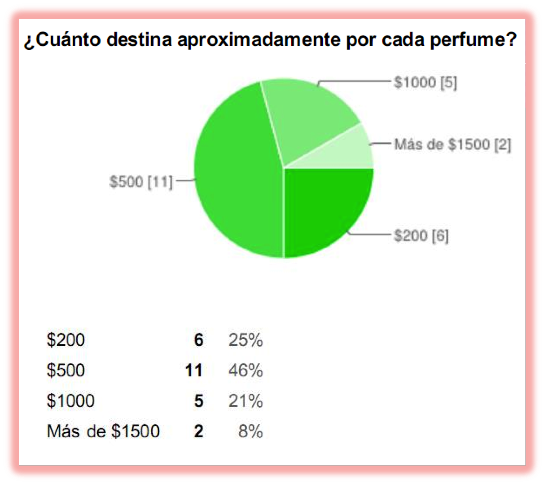 • 46% de las mujeres encuestadas dijo gastar aproximadamente $500.00 pesos mexicanos. En perfume lo que nos muestra el rango de precio de acuerdo al mercado dirigido.