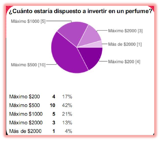 • El 42% de las encuestadas dijo que lo máximo que gastaría en un perfume serían $500.00 MN. Esto nos muestra el público al que va dirigido y el rango de precio que tendrá el nuevo perfume.