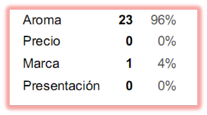 • De las mujeres el 96% encuestadas dijeron que la característica con mayor valor es el aroma. Sobre la marca y la presentación. Lo que nos expone que el aroma es la característica primordial.