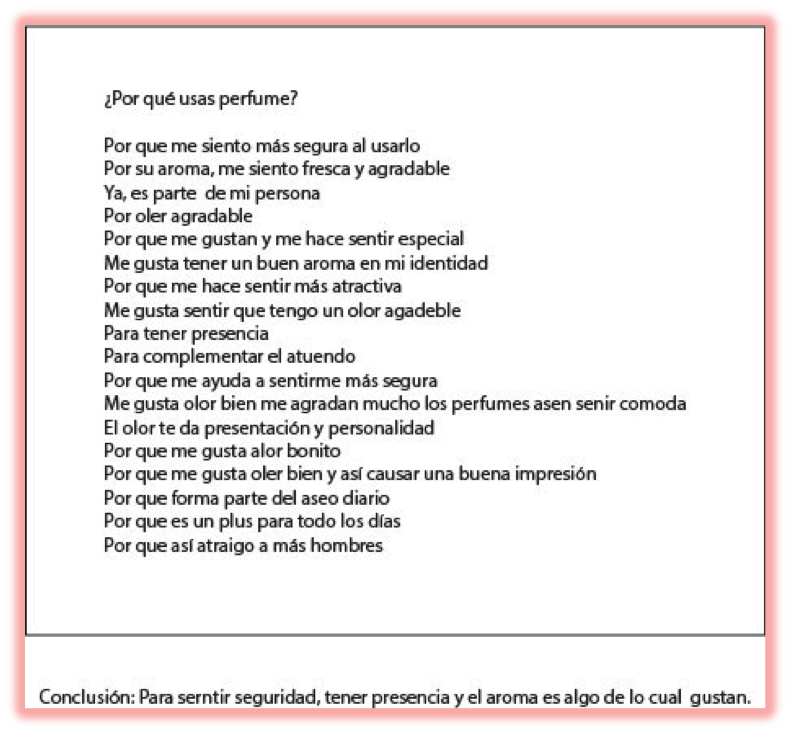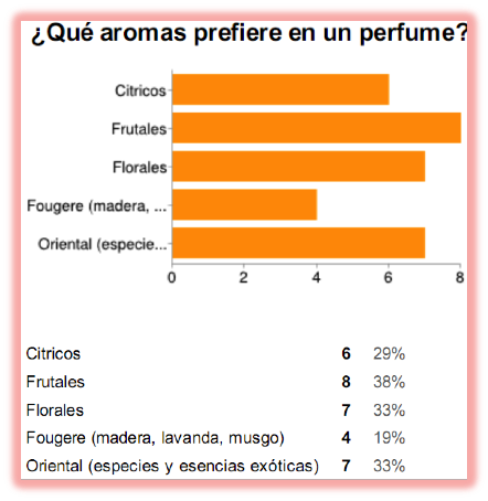 • El aroma que los usuarias prefieren son frutales, así que el aroma principal del perfume será frutal. Y que es el preferido en el mercado.