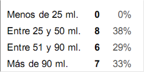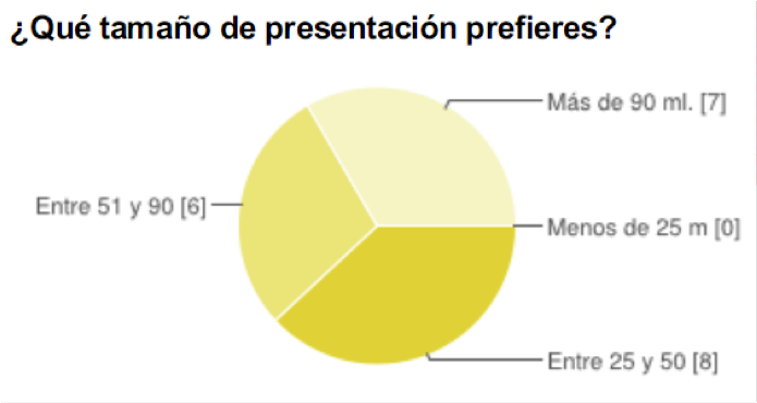 • El tamaño de presentación para un perfume que prefirieron fue entre 25 y 50 ml. Lo que nos muestra el tamaño del frasco de nuestro producto.
