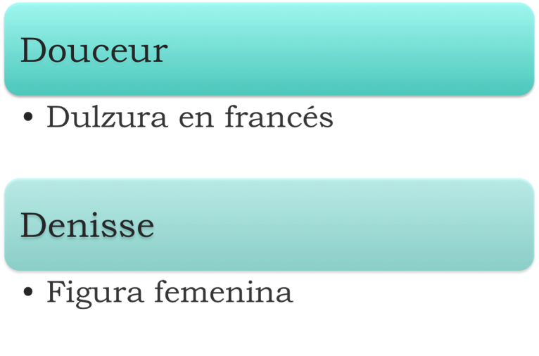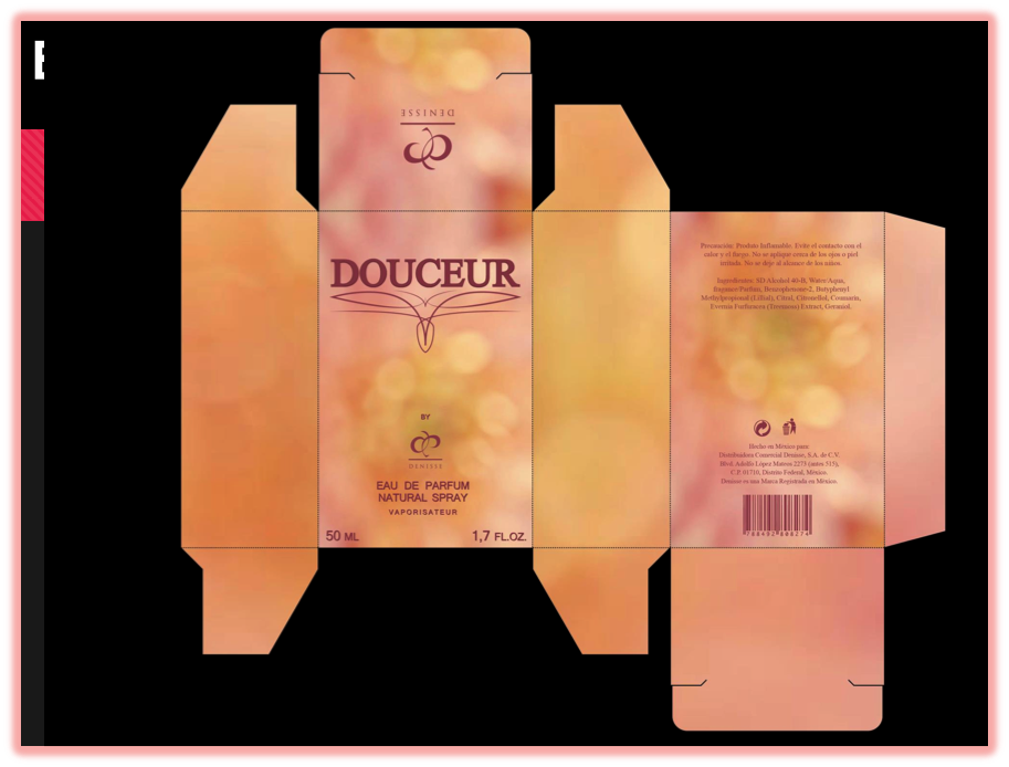 • El nombre del perfume proviene de la palabra “Dulzura”, en francés “Douceur” con evidentes connotaciones románticas. Así mismo la marca es el nombre propio “Denisse” que alude a una figura femenina, para que las consumidoras se puedan identificar tanto con la marca como con el perfume.