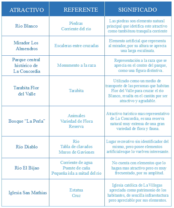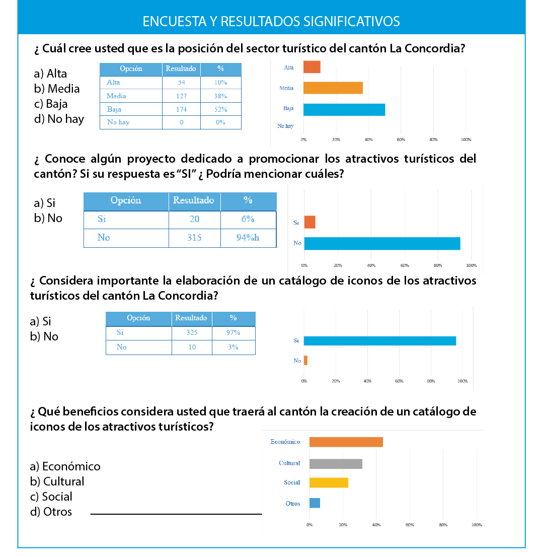 Se obtiene como resultado de los instrumentos de recolección de datos, el compendio de los atractivos turísticos más representativos del cantón La Concordia, constatando la importancia de implementar un sistema iconográfico que facilite su reconocimiento mediante su difusión. Este aporta en la economía el turismo y la cultura del cantón incentivando la visita y promoción de los mismos, razón por la cual se considera viable este proyecto, difundiendo de esta manera la existencia de los atractivos con los que cuenta La Concordia, generando conocimiento de los mismos dentro del cantón, a nivel provincial y con proyección a todo el país.