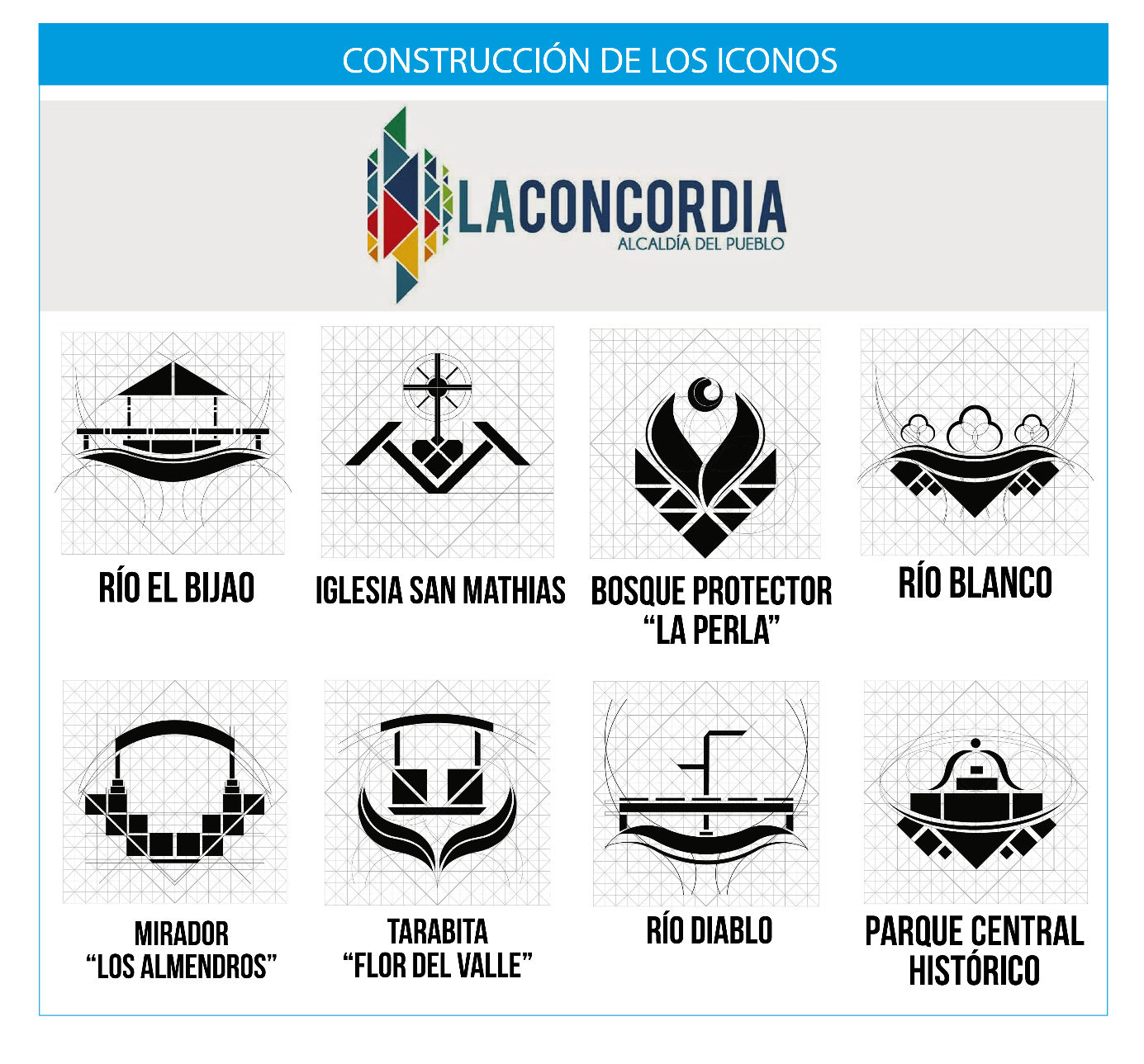 El desarrollo de la familia iconográfica contiene determinados rasgos similares que se conceptualizan en la marca del GAD La Concordia para así conservar rasgos identitarios de la marca ciudad La Concordia obteniendo una buena relación manteniendo su significado e identidad.
