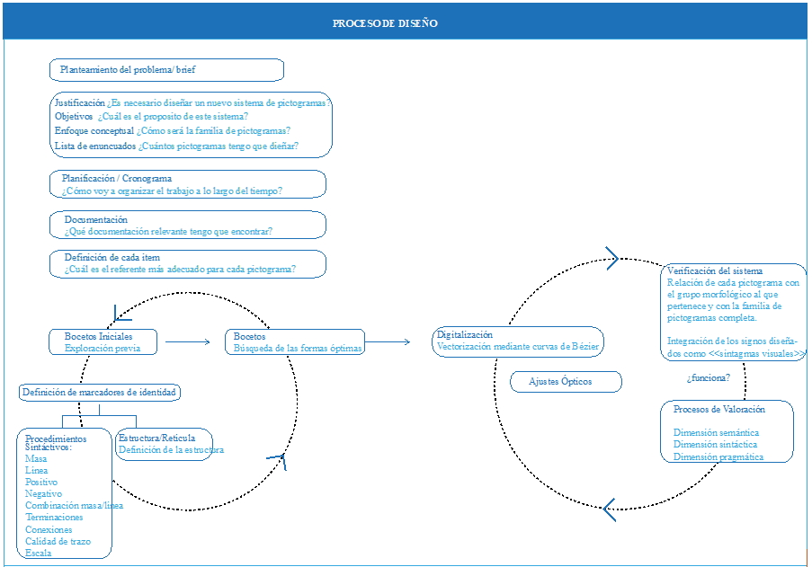 Para obtener una coherencia gráfica en el sistema iconográfico se realiza un proceso de diseño, referido a la creación de pictogramas relacionando forma y tipografía, se debe ejecutar etapas para el desarrollo de su estructura desde la parte conceptual teórica y gráfica. (Gonzáles, Miranda & Quindós, 2015)
