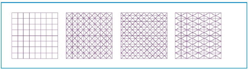 La anterior figura muestra cuatro tipos de retículas, empezando de izquierda a derecha: cuadrícula, ángulo de 45`, ángulo de 60` y ángulo de 30` las cuales se utilizan en el proyecto.