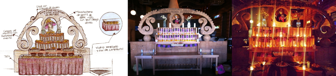 La imagen 5 da muestra de uno de estos montajes que se realizaron fuera del IADA, el restaurant mexicano “María Chuchena” solicitó la propuesta de un altar interactivo, el cual tuvo una doble función, primero la de esquematizar un altar de muerto tradicional y al mismo tiempo servir como mesa de bufet, fue fabricado por un grupo de alumnos de la misma institución, quienes realizaron la estructura del arco principal a base de unicel, dándole forma y acabado por medio de diversas técnicas artesanales, simulando cantera en color arena, presente en los espacios interiores del restaurante, los niveles fueron elaborados mediante trabajos de carpintería, en los que se realizaron una especie de celosías de madera sobre la mesa principal, para colocar elementos alusivos a un altar tradicional como flores, papel picado, veladoras y calaveras de azúcar, el principal reto fue generar una propuesta que hiciera alusión a un altar, pero que invitara a los usuarios a tomar los alimentos ahí exhibidos.