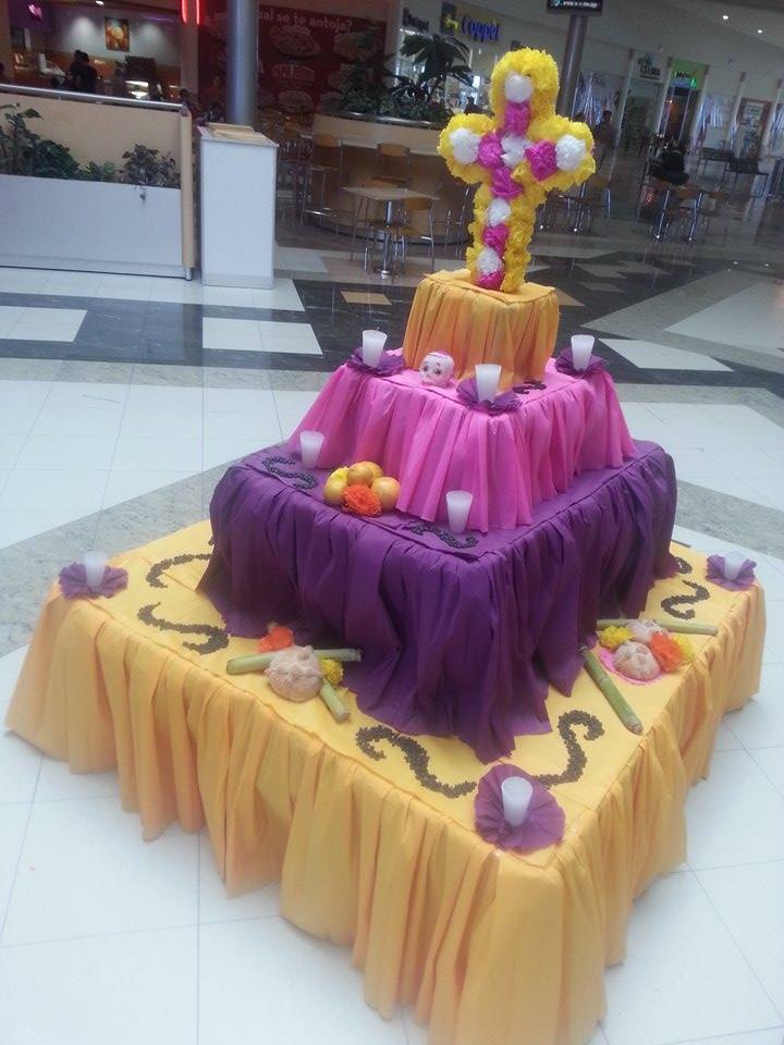 También el centro comercial Plaza Sendero de Juárez, ha solicitado en dos ocasiones la instalación de montajes alusivos a altares; la primera ocasión fue en el año 2013 y se solicitó la realización de un altar en el vestíbulo central del área de comidas, que a su vez pudiera reutilizarse la estructura para una muestra artesanal que se realizaría en los días posteriores, por lo que se optó por la elaboración de una estructura de 4 vistas en 4 niveles, forrada en papel crepé haciendo alusión a los pliegues de las faldas de las indígenas tarahumaras (imagen 7), únicamente se integró una cruz de flores, veladoras, calaveras de azúcar, pan de muerto, frutas y granos, conteniendo los elementos más básicos del altar pero de una manera concreta y conceptual.