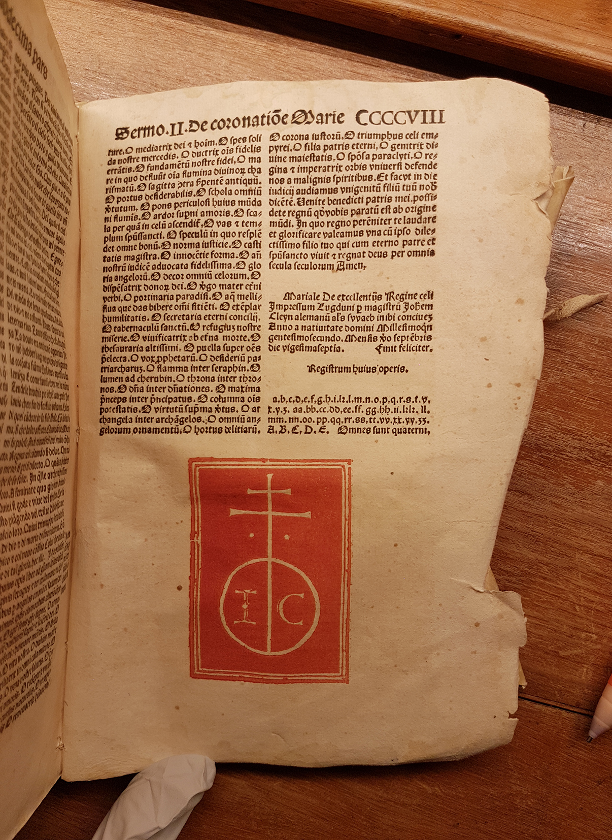 Figura 1. Marca de impresor. Uno de los símbolos más antiguos del hombre, el motivo de la orbe y la cruz encontrado en una cámara de la pirámide de Keops en Gizeh, que fue labrado en piedra como una marca de excavación. En la época Joben Cleyn simbolizaba “Dios reinará sobre la tierra” y varias interpretaciones gráficas fueron usadas por diversos impresores como la Sociedad de Impresores Venecianos, entre otros. Post-incunable Mariale de excellentus Regine Celi (1502). BAO: CO BT 604 M37 1502. (Fotografía de la autora, Derechos Reservados Biblioteca Armando Olivares).