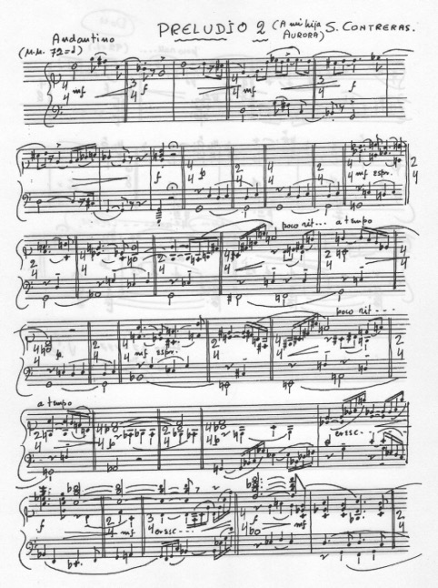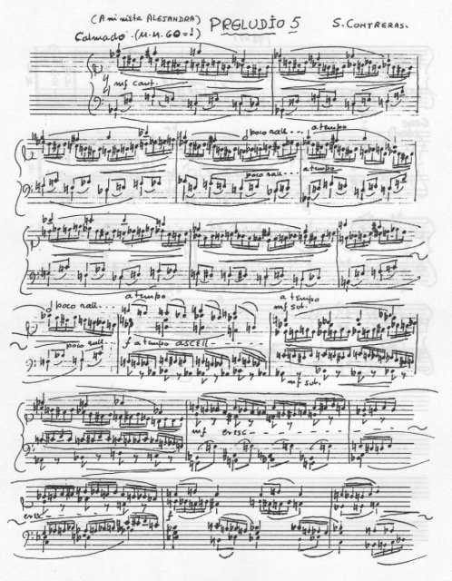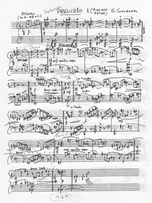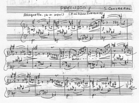 Aquí podemos observar copia de la primera página de la partitura manuscrita del Preludio nº. 1 el cual, como ya vimos, está dedicado a su hija mayor Nélida. En cuanto al elemento armónico, Contreras recurre a estructuras de alturas organizadas en acordes triadas en inversión, estructuras por cuartas y otros acordes tonales con notas añadidas. Además, recurre tanto a la poli-tonalidad como a la mixtura tonal-modal y la modulación a regiones lejanas. Sus perfiles melódicos los encontramos bien definidos en estos preludios con la particularidad del recurso de invertir los motivos y temas. El cambio de compás, el uso de pasajes monorrítmicos y la poliritmia vertical son elementos que caracterizan la textura rítmica.
