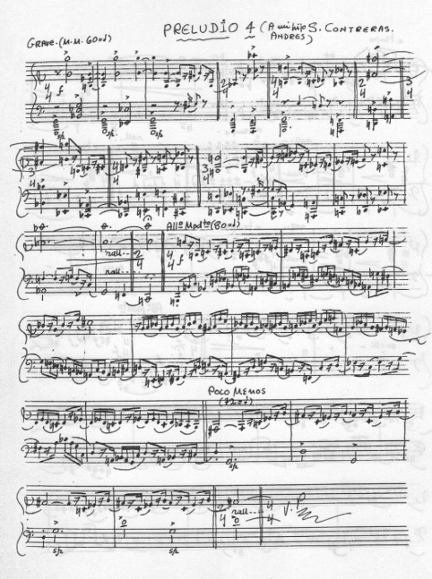 El tercer preludio quizá sea el más profundo y bello de los siete. Al escucharlo se descubre una atmósfera evocativa y un carácter de intimidad personal, una mezcla de tristeza, melancolía y ternura. En el aspecto constructivo y formal encontramos una economía de medios, es decir pocos elementos que, sin embargo, son tratados con rigor y maestría compositiva. En su escritura se evidencia el uso del recurso del contraste que explota el compositor para ir generando forma musical. En el aspecto armónico Contreras emplea estructuras de alturas organizadas por cuartas, así como acordes triadas tonales. En las partes de acompañamiento se emplean motivos ostinatos y bordaduras inferiores, lo cual le imprime una textura homofónica interesante. En la melodía se aprecian pasajes de color modal, sobre todo en el registro grave. La textura es en general homofónica y de bloques de acordes con breves pasajes melódicos alternados entre la voz superior e inferior. Veamos ahora copia de la partitura del cuarto preludio dedicado a su hijo Andrés: