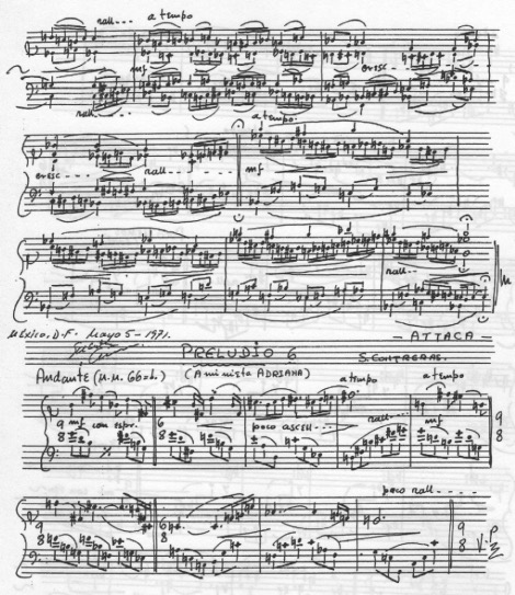 Si bien se podría afirmar que Salvador Contreras no fue un compositor “pianístico”, es decir aquel compositor que crea obras para el lucimiento virtuosístico; sin embargo, en su catálogo se pueden encontrar obras para piano de gran calidad y belleza, entre las que destacan los Siete preludios para piano escritos entre enero y julio de 1971 y sus dos Sonatinas de 1962 y 1975 respectivamente. Contreras concibe la escritura pianística más bien como un medio de expresión orquestal, ve en el piano otro medio expresivo cuya sonoridad le atrae y le da un tratamiento de orquesta, logrando obras de gran factura enriquecidas por el timbre de este maravilloso instrumento. Así, Contreras a través de la voz del piano crea atmósferas: sonoridades que envuelven al público y son capaces de transportarlo a estados de ánimo evocativos, misteriosos, poéticos y profundamente oníricos.
