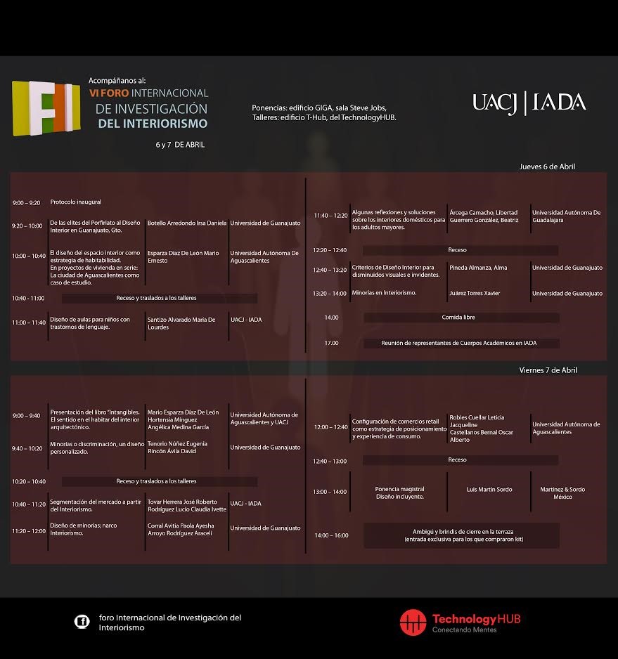 Sin lugar a dudas el VI Foro Internacional de Investigación de Interiorismo dejo un gran aprendizaje a los presentes. Se logró observar un ambiente de convivencia e interés por los temas presentados, ya que el interiorismo para minorías resulto ser un tópico de gran utilidad, al ver la cantidad de vertientes que se pudieron generar en torno al diseño de interiores. De igual manera las instalaciones de Technology Hub, ayudaron a que el ambiente fuera más agradable para todos los presentes.