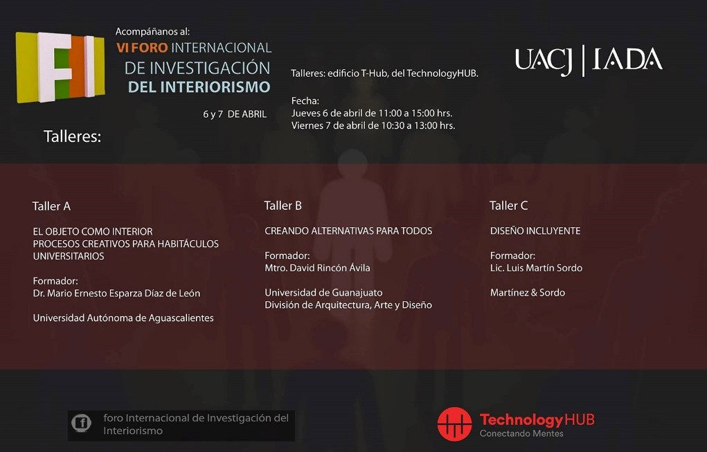 En la edición del VI Foro Internacional de Investigación del Interiorismo, a diferencia de los anteriores, se incluyó la participación de tres talleres con el objetivo de reforzar la teoría dada en las ponencias con ejercicios prácticos. Dichos talleres se llevaron a cabo a la par con las conferencias, dentro de las mismas instalaciones  de Technology Hub en donde solo un grupo minoritario de alumnos podía asistir.