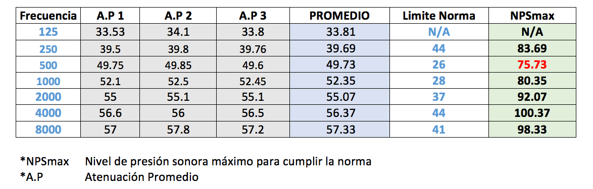 Tabla 2. Resultados de los promedios de atenuación acústica, promedio general, límite de la norma y Ambientes con niveles máximos de presión sonora para cumplimiento de la NOM-011-STPS. Elaboración propia.