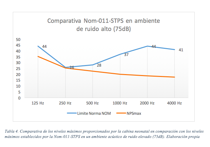Tabla 4. Comparativa de los niveles máximos proporcionados por la cabina neonatal en comparación con los niveles máximos establecidos por la Nom-011-STPS en un ambiente acústico de ruido elevado (75dB). Elaboración propia