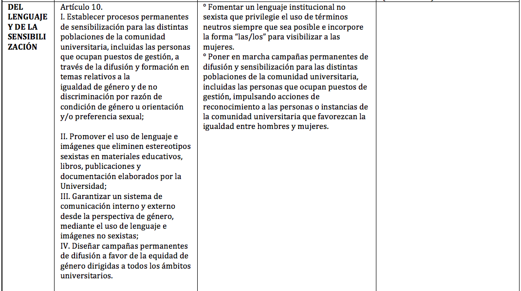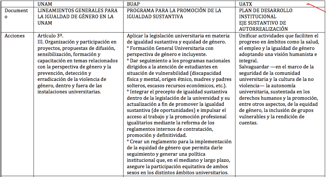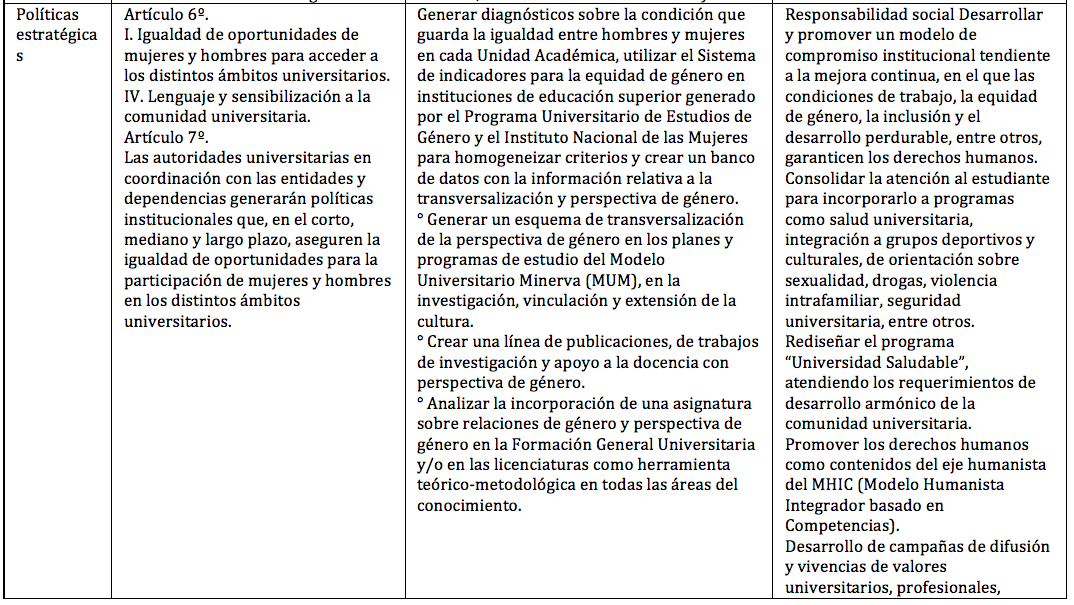 En este sentido y para fortalecer una actitud crítica y ética ante su entorno, se sugiere que se adopte una transversalización de la perspectiva de género que abone a la estrategia del Plan Nacional de Desarrollo 2013-2018, que sostiene la urgencia de impulsar la inclusión social y la no discriminación de las mujeres y cuyo principios han adoptado en mayor o menor medida por las universidades públicas en diversos planes o lineamientos (ver tabla 1),
