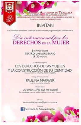 Cartel en formato vertical que invita a conmemorar el Día Internacional por los derechos de la mujer en la Universidad Autónoma de Tlaxcala. La gama cromática se encuentra en tonalidades de rosa: el fondo del cartel en un tono claro para permitir el contraste con los tonos oscuros de la tipografía y facilitar la lectura. En cuanto a los textos, se presentan usando tres familias tipográficas. La última parte del cartel tiene una finalidad informativa y utiliza una tipografía de trazos simples de palo seco y en una versión light para no desviar la atención del título central.