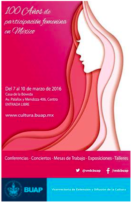 Este cartel fue utilizado para el evento “100 años de la participación femenina en México”, la institución convocante fue la BUAP y los destinatarios; la comunidad universitaria de dicha institución.