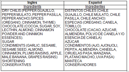 Los siguientes ingredientes son utilizados para la elaboración del mole, los cuales se presentan en el idioma en el que se va exportar (dado lo que establece la FDA) e idioma español para su mejor comprensión.