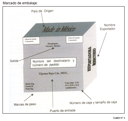 El marcado de embalaje es una serie de datos de tipo obligatorio para su exportación los cuales son impresos en la caja o embalaje que a continuación  mencionaremos en la siguiente imagen:
