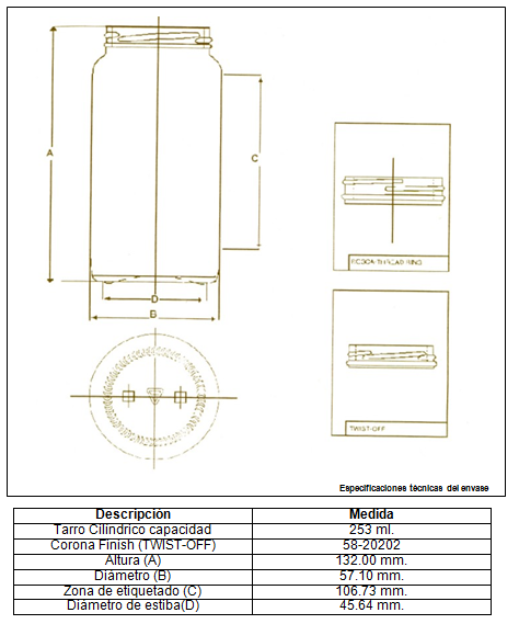 Esta presentación se justifica por determinar que nuestro producto rinde 4 porciones, en donde el promedio de personas de las familias hispanas es de 4 personas, lo cual indica la aceptación del frasco no debe ser menor al 90%, y por cuestiones de seguridad permitirá cumplir con dicha norma, 230 gr. Es el peso idóneo, para el frasco que estamos proponiendo.