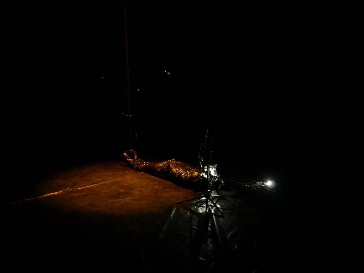 Con respecto a las decisiones, vale mencionar dos aspectos: el de las bolsas y el del ojo. Las bolsas utilizadas en la operación eran de polietileno. El cuerpo que aparece envuelto en estas bolsas de basura es la metáfora de los cuerpos desaparecidos en la dictadura, que los activistas paraguayos suelen utilizar, dejando estas bolsas antropomórficas en plazas o frente a comisarías, en los aniversarios del golpe de estado, o el 3 de noviembre cumpleaños del dictador. En mi caso, deslicé mi cuerpo dentro de estas bolsas negras de polietileno para experimentar como este material afectaba mi actividad vital a la vez que era suspendido de cabeza por un sistema de poleas, para luego ser sumergido en un recipiente con agua. Inmediatamente, advertí el riesgo que corría puesto que un estudiante de arte en Colombia unos años atrás se había asfixiado en una performance utilizando estas bolsas, por lo que tomé las precauciones correspondientes, dejando que el aire entrase lo suficiente para evitar la asfixia, además de trabajar con un profesional rescatista que estaría supervisando el gesto mientras se realizara. Este aprisionamiento me reveló a este ojo-cuerpo como un cuerpo sonoro que respira.