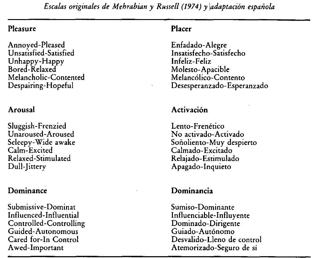 Gurbindo , N. & Ortega, J. E., 1989. Adaptación de las escalas de placer, activación y dominancia de Mehrabian y Russell en sujetos hispanoparlantes. Revista de Psicología Social.