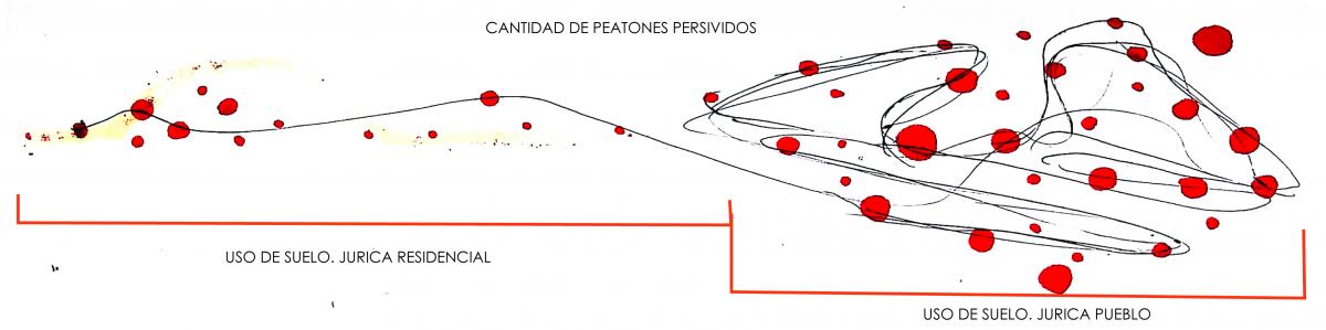 Los límites y la segregación, son perceptibles fundamentalmente desde el roll de transeúnte. Desde esa llegada descrita anteriormente, por un puente peatonal, excluyente y aislado. El tránsito por las calles empedradas que luego de una media hora de camino lastima los pies y se hace insoportable. Además, en este papel, es donde se entiende que, al caminar la traza urbana de Jurica Residencial abunda la exclusión y la preferencia hacia el automóvil y por tanto a los que cuentan con este. Las distancias de la traza urbana lo demuestran, alcanzando medidas de 845 m en una avenida principal y mínimas de 100 m en calles secundarias (ver imagen 1). No mucho más lejos, la banqueta, habla de un desacuerdo o falta de conversación entre vecinos, al estar esta, compuesta por secciones correspondientes con cada vivienda.